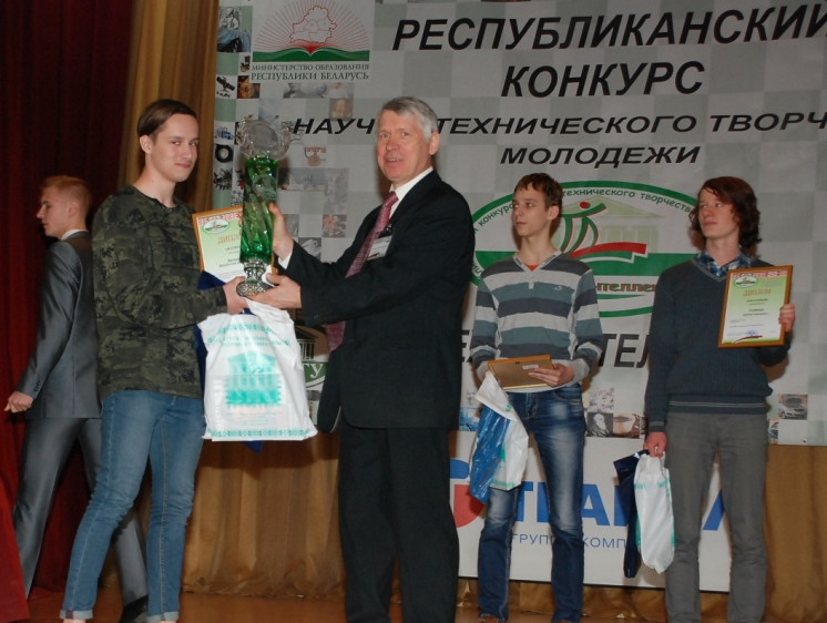 На фото: заведующий кафедрой «Электротехника и электроника» учреждения образования «Белорусский национальный технический университет», кандидат технических наук, доцент Ю.В. Бладыко вручает диплом победителя и памятные подарки Зелинскому Владиславу (информационный ресурс – сайт www.bntu.by/tehnointellekt-bntu)